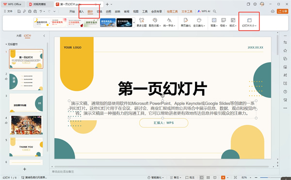 1、打开想要设置显示比例的幻灯片,点击“设计”菜单,然后选择“幻灯片大小”按钮。