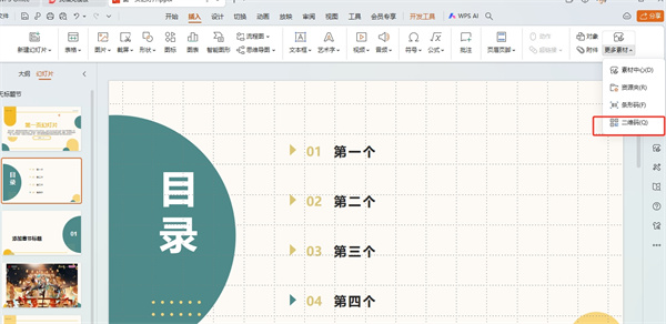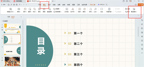 2、点击菜单栏的“插入”选项卡,选择“更多素材”按钮。